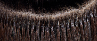 Nach den Färbprozessen in verschiedene Farbnuancen erfolgt der letzte wichtig Verarbeitungsprozess, das Bonding, die Verbindungsstelle zwischen Eigenhaar und Extensions. Diese bestehen aus einem Polymer das dem menschlichen Haarkreatin sehr ähnlich ist. Dadurch verhält sich die Verbindung ähnlich wie das Haar, dehnt sich bei Nässe und zieht sich beim Trocknen wieder zusammen. Das sorgt für einen sicheren Halt.